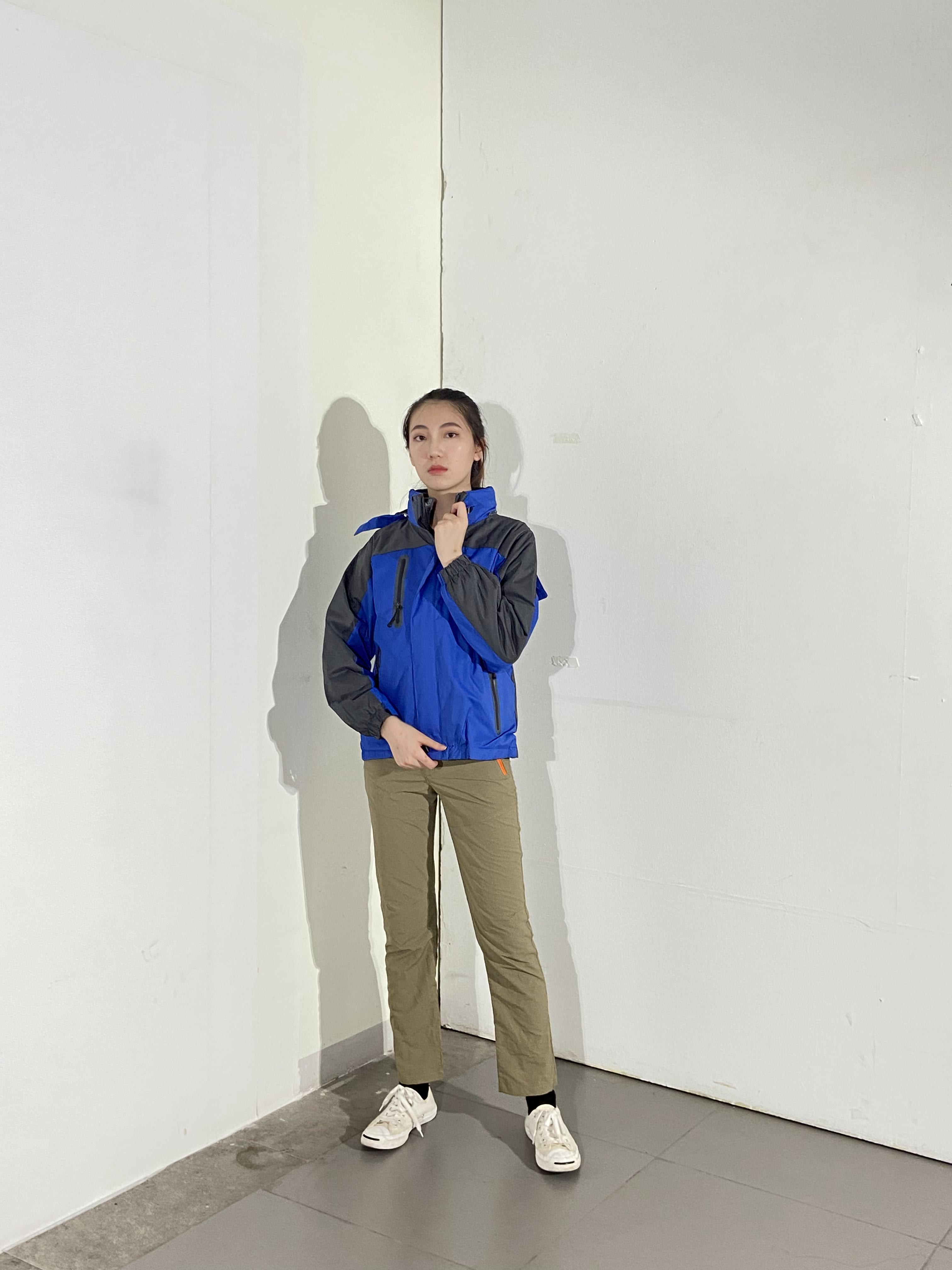 Name: Design personalized jacket, model try on, order black and blue, detachable hat, windbreaker jacket supplier