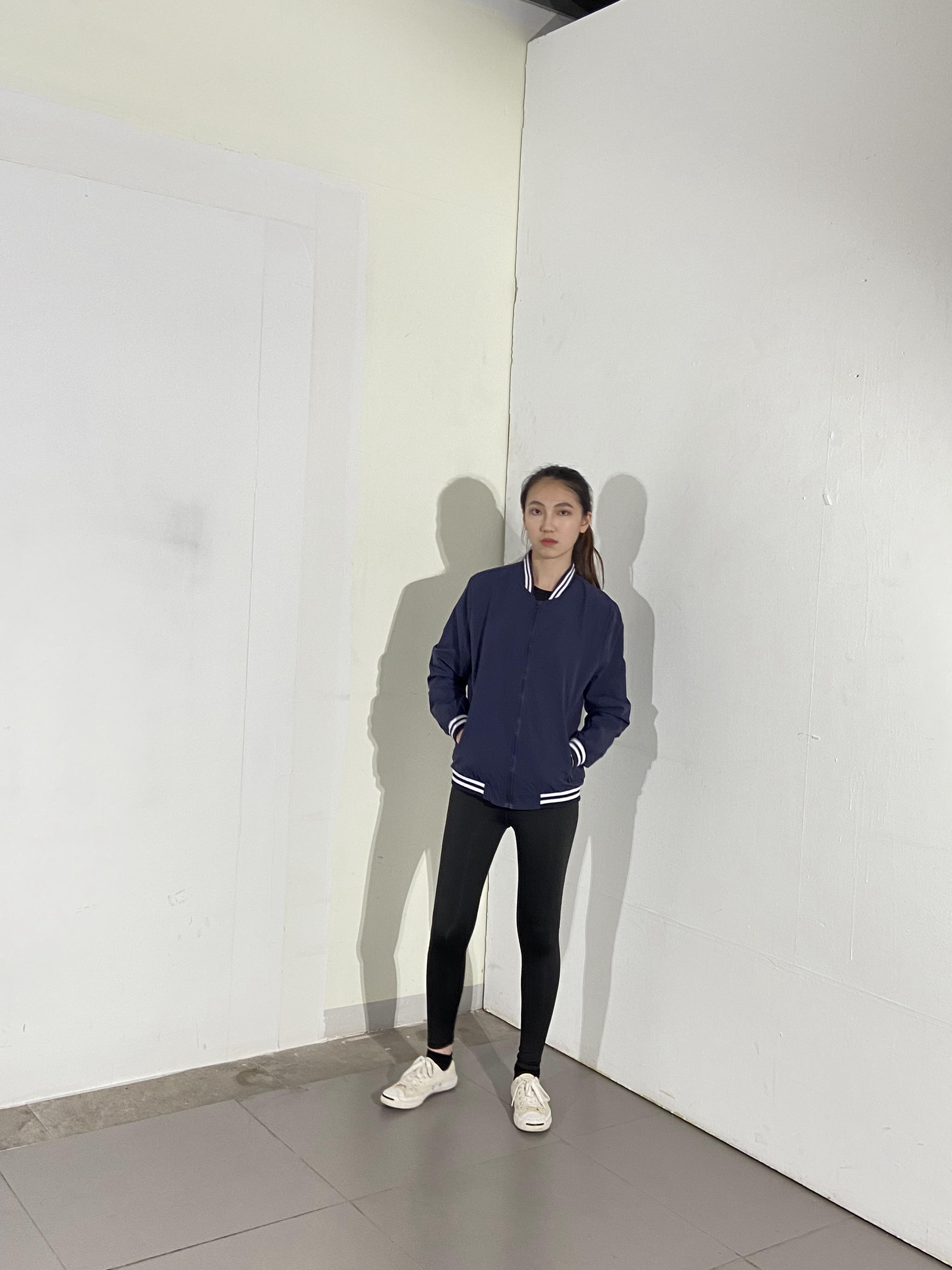 Name: Customized stand-collar comfortable jacket, navy blue and blue and white side sports jacket, model try on jacket manufacturer