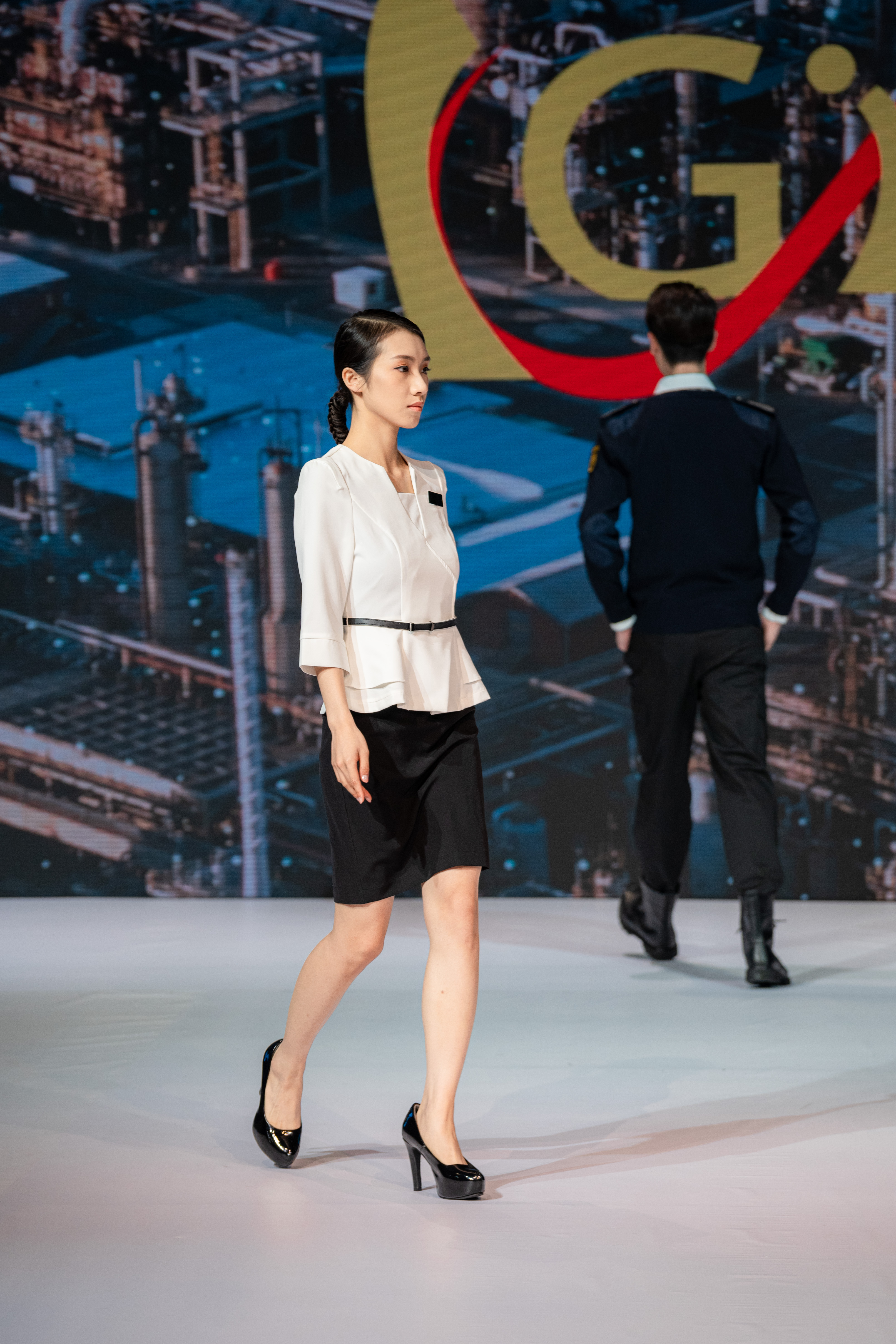 - BD-MO-096 Order online reception uniforms Model display Custom-made v-neck ruffled tops Comfortable and elegant reception uniform shop
