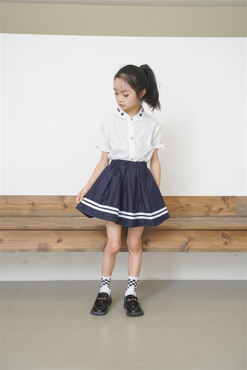 Design British style shirt and school uniform suit Custom-made cuffs with contrasting stripes, school skirts design with anti-glare safety pants, neckline with contrasting stripes design, school uniform manufacturing factory
