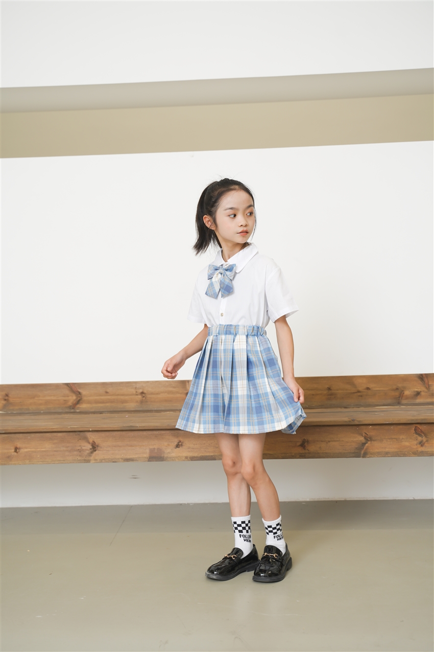 Design JK wind blue and white short-sleeved children's school uniform, customized plaid skirt, anti-glare lining, waist elastic design