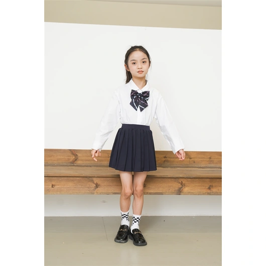 BD-MO-161 Design British style shirt and school uniform suit Custom-made cuffs with contrasting stripes, school skirts design with anti-glare safety pants, neckline with contrasting stripes design, school uniform manufacturing factory